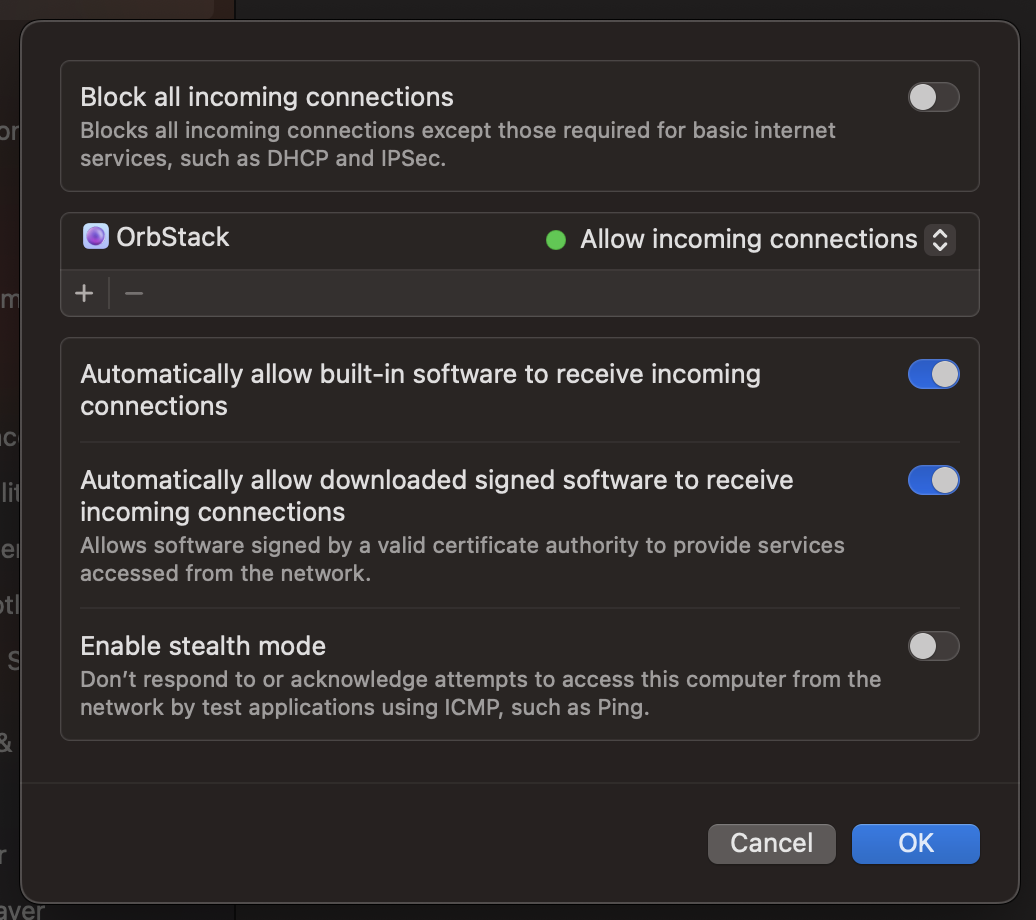 Please ensure your Firewall (System Settings -> Network -> Firewall) is turned on and Orbstack is added to the list of applications allowing incoming connections. (Orbstack should do this for you)
