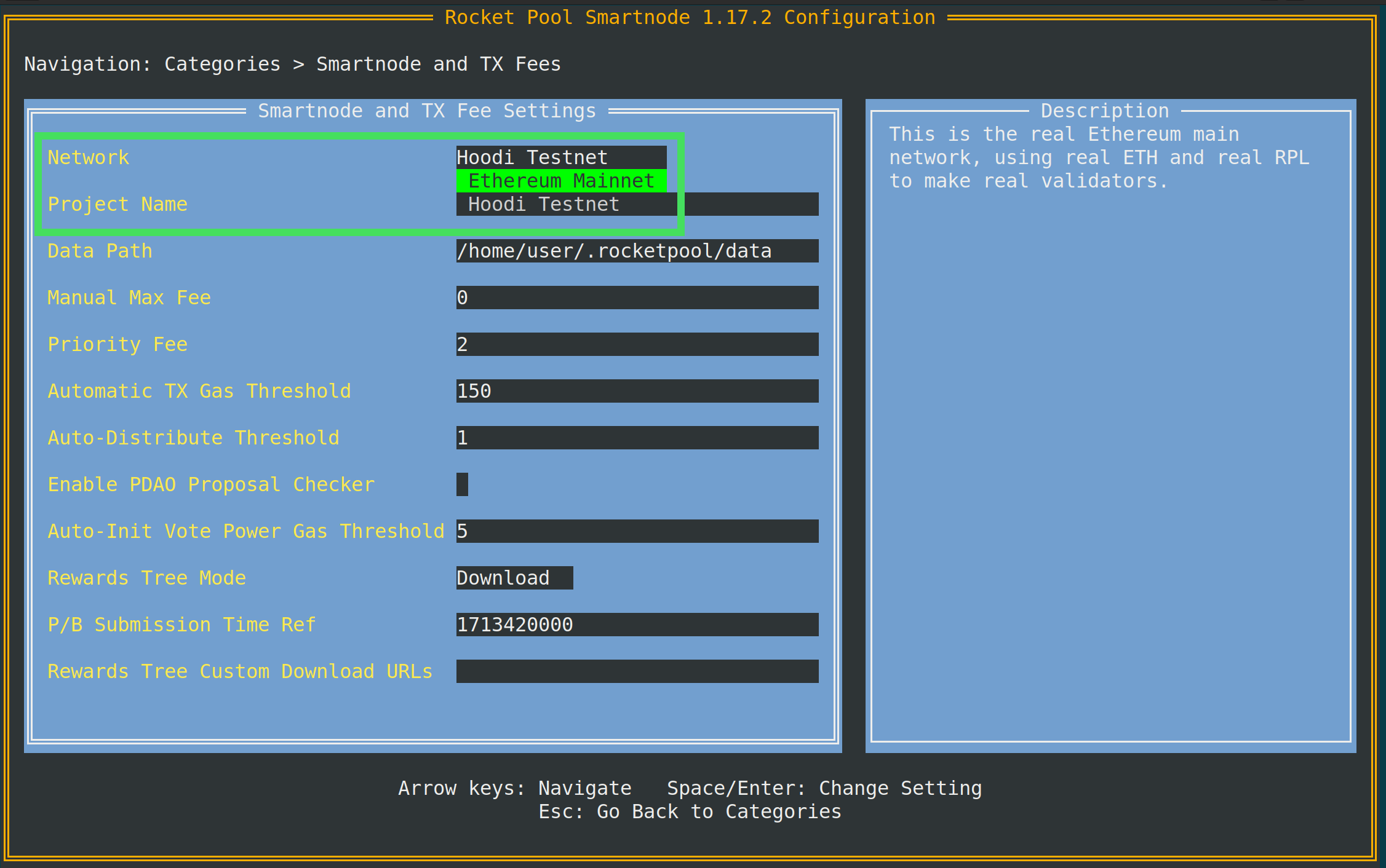 Next, open the Smartnode and TX Fees category and change the Network drop down from Hoodi Testnet to Ethereum Mainnet: