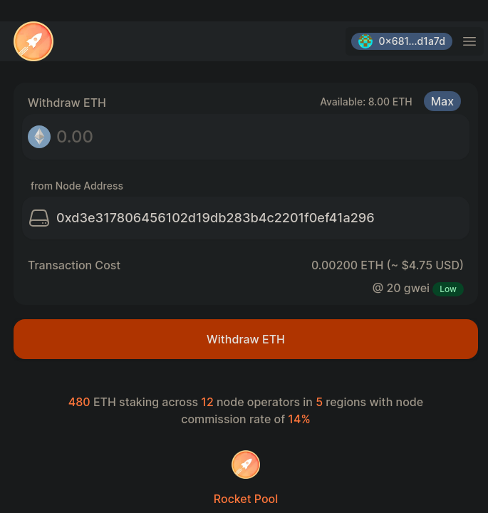 You'll be able to see how much ETH is available for withdrawal in the top right. After you input your desired quantity and confirm the node address, click the orange Withdraw ETH button to send the transaction to the network.